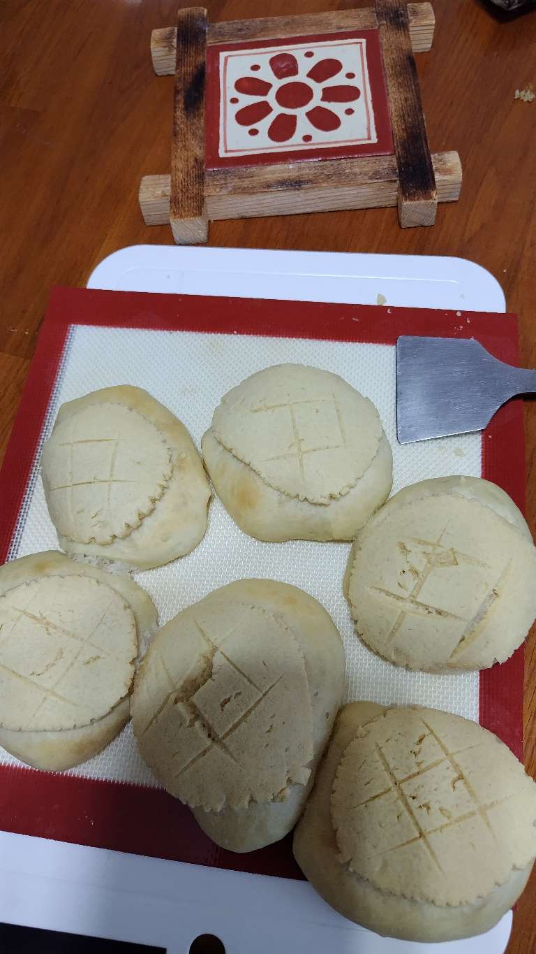 2024/08/03 今日もパン作りが趣味の主人がメロンパンを作りました。 パンとクッキー生地のバランスがうまくいかなかったせいかパンだけが膨らんでクッキー生地はそれに追いつかず見た目はかっぱのようになりました😅💦 けど味はちゃんとメロンパンでした👍 何かコツがあるのでしょうね。 また次回作を期待しよう😊
